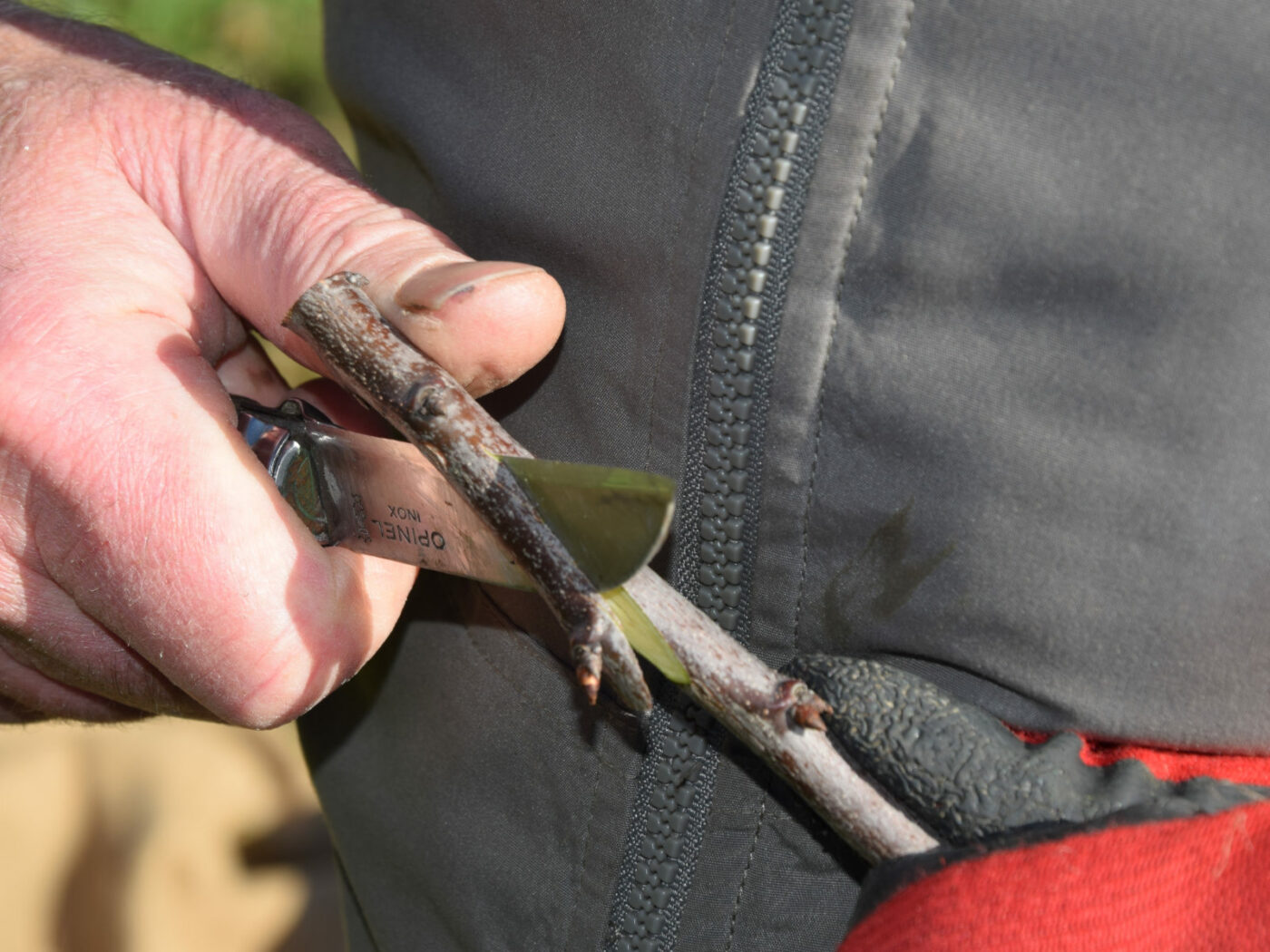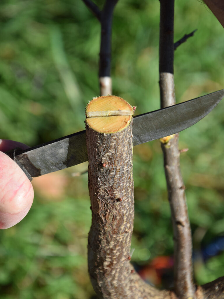 Le greffon est présenté en vis à vis de la coupe du porte-greffe afin de pouvoir comparer l’épaisseur du liber.