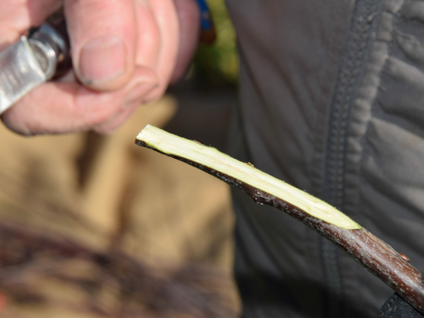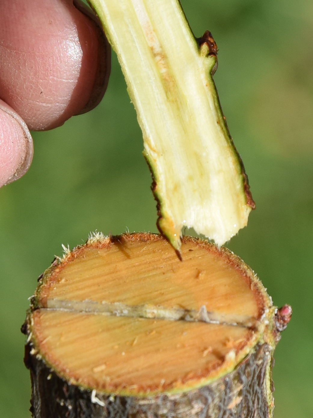 Sur le porte-greffe, le liber, vert clair, est bien visible sur la droite de la photo (environ 2 mm de large).