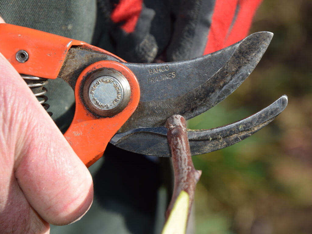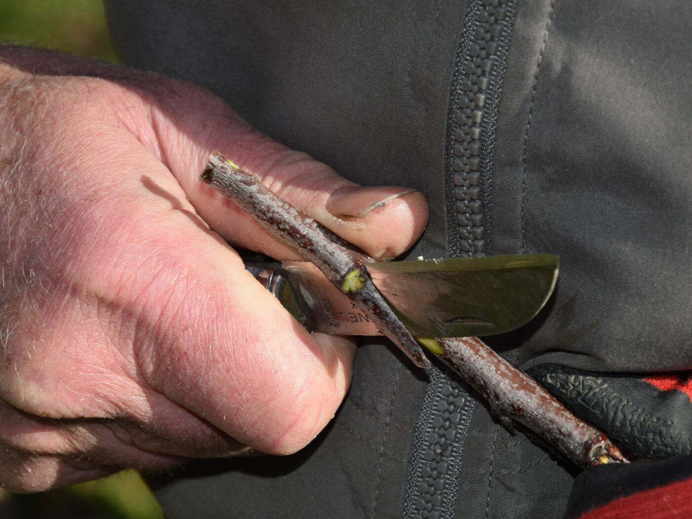 Pour aller plus loin : pourquoi deux bourgeons ? Un seul serait suffisant, mais comme il peut être cassé, mangé (oiseaux, insectes), on préfère en mettre deux. Si on en conserve trois ou plus, le greffon est plus long, plus fragile. Pour toutes les greffes « à bois » (fente, cadilhac, anglaise, couronne, incrustation…) deux bourgeons est donc un bon compromis. Si l’on manque de greffons, il est possible de n’en conserver qu’un seul.