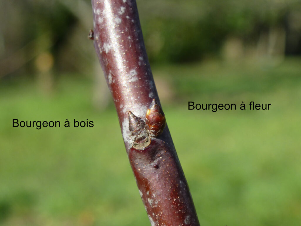 Ou association d’un bourgeon à fleur (souvent deux), plus rond et plus clair et d’un bourgeon à bois (plus petit, plus pointu, plus foncé), comme ici :