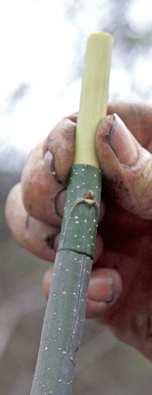 Le SIFFLET (ou Flûte, Chamarel) : en montée de sève, dès que l’écorce se décolle, un tube d’écorce, avec un bourgeon, est prélevé sur une pousse vigoureuse (gourmand) de l’arbre donneur de greffons.