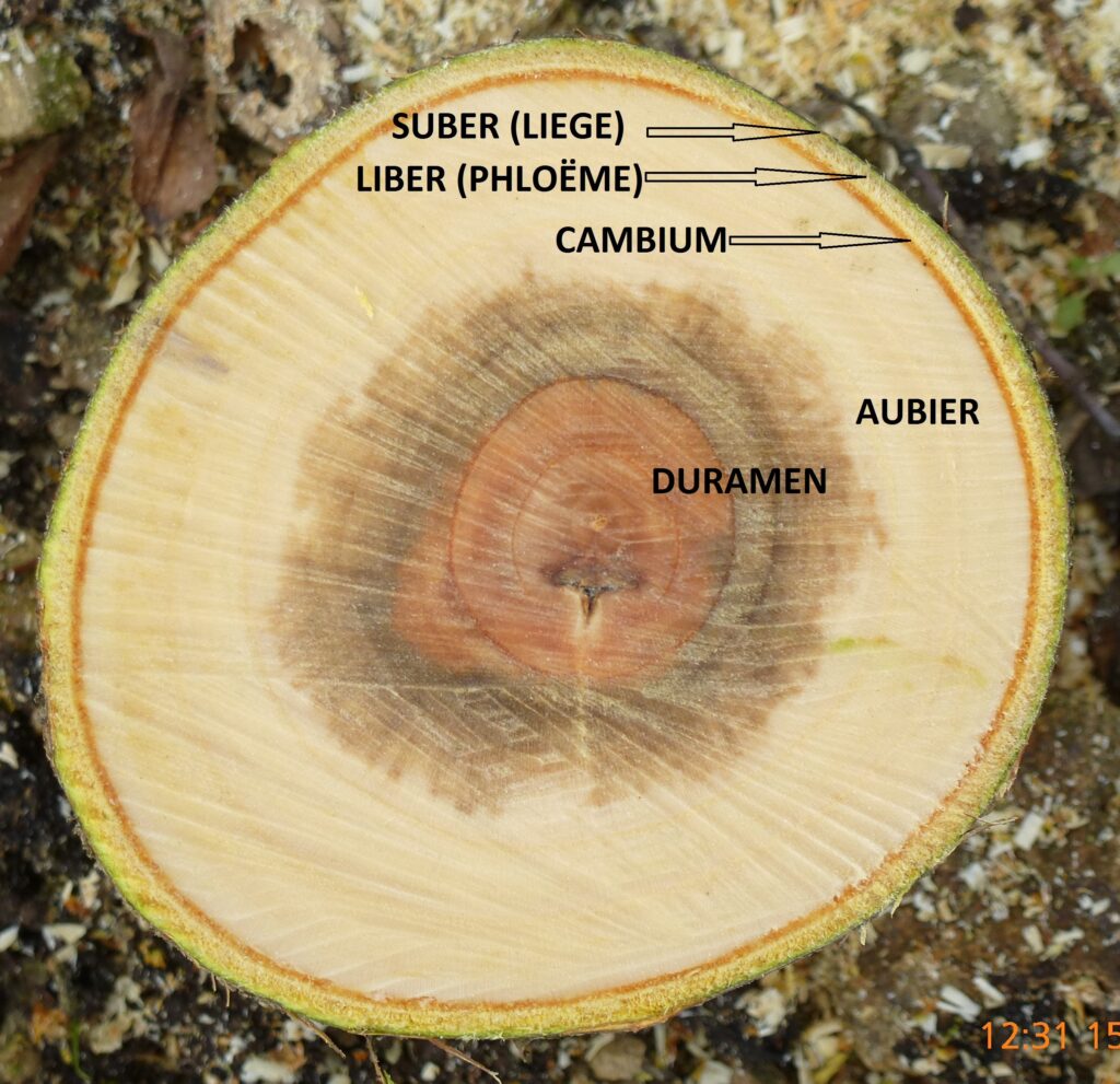Sur la coupe d’une branche âgée, on distingue l’aubier de couleur claire, à l’extérieur, constitué des vaisseaux fonctionnels et le duramen, au centre, de couleur plus foncée, constitué des vaisseaux n’étant plus fonctionnels.