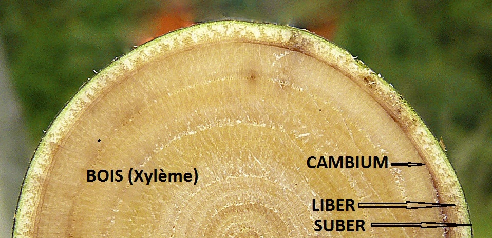 Le cambium génère côté intérieur le xylème (ou bois), ensemble des vaisseaux conducteur de la sève brute circulant des racines vers le feuillage ; et du côté extérieur le phloëme (ou liber) ensemble des vaisseaux conducteurs de la sève élaborée circulant des feuilles vers les autres organes.